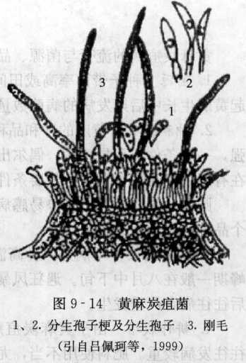 病原物為黃麻炭疽菌(CoLLetotrichiun corchori Pavgi & U. P. Singh),無性真菌類炭疽菌屬成員。病菌分生砲子盤散 生病部表面,基部埋生在病組織內(nèi)。分生抱子盤周緣有剛毛, 剛毛直立或彎曲,基部較粗,上端尖細(xì),顏色為黃褐至黑褐 色,通常有2?5個(gè)隔膜。分生抱子著生于抱子梗頂端,無色,單胞,新月形(圖9-14)。