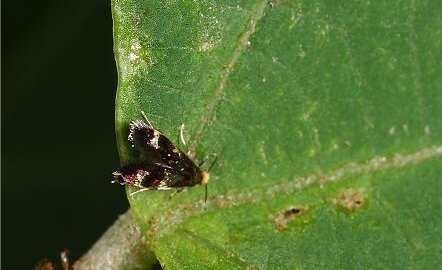 成蟲(chóng):體長(zhǎng)為15?18mm,翅展為31?40mm,體翅均茶褐色。前翅長(zhǎng)方形;近翅基中部有1土紅色隆起小塊,小塊中縱陷;近外緣有淡肉黃色小區(qū);沿前緣基部2/5至近頂角處有1條紅褐色帶紋;從頂角向后緣前端伸出三角形的黑色帶紋;其后有白色線紋分割的2個(gè)黑色斑。后翅較寬,灰褐色。腹部密生淡黃褐色毛,各節(jié)有白毛橫帶1條。