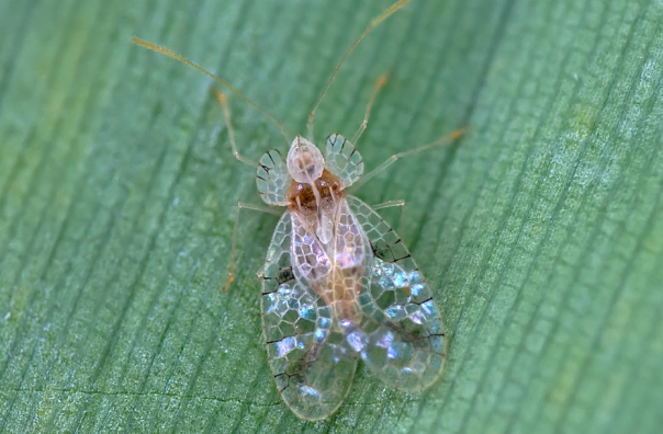 成蟲:體長2.1?2.4mm,剛羽化時呈銀白色,后逐漸轉(zhuǎn)變?yōu)榛野咨n^小,棕褐色,復(fù)眼大而突出,黑褐色。觸角4節(jié),第三節(jié)細(xì)長,約為全長的1/2,末節(jié)稍膨大,棕褐色。具刺吸式口器,喙4節(jié),末端黑色,伸達(dá)后足基節(jié)間。在前胸背板兩側(cè)及頭頂部分有一塊白色突出膜,上具網(wǎng)狀紋,形狀特異,似“花冠”,側(cè)背板呈翼狀擴(kuò)展,并向上翹起,前部形成囊狀頭兜,前尖后圓,覆蓋頭部,后部與三角突的壁狀中脊相連接,兩側(cè)為小翼狀的側(cè)脊。胸部腹板的中央兩側(cè)隆起,中央呈槽狀,前窄后寬,喙置于槽中。足細(xì)長,跗節(jié)1節(jié),末端具2爪。前翅膜質(zhì),近透明,長橢圓形,基部窄,端部寬圓,凹凸不平,膜質(zhì)透明,具網(wǎng)狀紋,翅基及近端 部有黑色橫斑,翅緣具毛,前翅遠(yuǎn)超過腹末;后翅狹長,無網(wǎng)紋,僅達(dá)腹末,寬約為前翅的1/3,無網(wǎng)紋,有毛。雌蟲腹部可見8節(jié),末端錐形,產(chǎn)卵器明顯;雄蟲腹部瘦長,可見7節(jié),腹末平截,具1對鐮刀狀抱器。